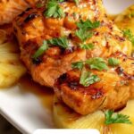 This Baked Pineapple Salmon recipe features tender salmon fillets baked with a delicious tropical marinade of pineapple juice, soy sauce, honey, garlic, and ginger. Topped with fresh pineapple chunks and garnished with green onions and sesame seeds, this easy-to-make dish combines savory and sweet flavors perfect for a healthy and flavorful dinner.