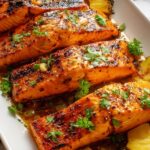 This Baked Pineapple Salmon recipe features tender salmon fillets baked with a delicious tropical marinade of pineapple juice, soy sauce, honey, garlic, and ginger. Topped with fresh pineapple chunks and garnished with green onions and sesame seeds, this easy-to-make dish combines savory and sweet flavors perfect for a healthy and flavorful dinner.