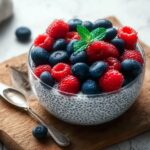 This Chia Seed Pudding with Coconut Milk and Berries is a simple, nutritious, and delicious no-cook breakfast or snack option. The creamy coconut milk blends beautifully with chia seeds, creating a naturally thick pudding that’s lightly sweetened with maple syrup or honey. Topped with a refreshing mix of berries and optional shredded coconut and mint, this recipe offers a delightful balance of flavors and textures while being vegan, gluten-free, and low in calories.