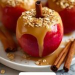 Delight in the comforting flavors of Cinnamon Oatmeal Stuffed Apples paired with a rich Homemade Vanilla Custard Sauce. This warm, baked dessert features tender apples filled with a cinnamon-spiced oatmeal mix, nuts, and dried fruit, served with a smooth, creamy custard that adds a perfect vanilla sweetness.
