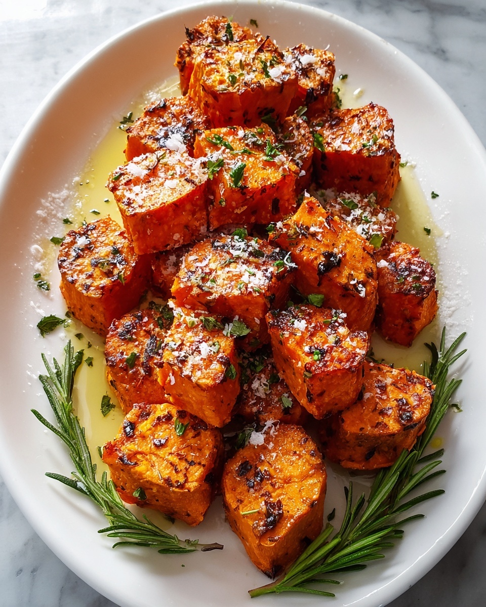 Delight in these Crispy Baked Sweet Potato Bites, perfectly seasoned with garlic, smoked paprika, and sea salt, then topped with a fragrant Parmesan herb butter. This easy-to-make side dish offers a healthy twist with crispy edges and a rich, buttery herb finish, ideal for snacks or meals.