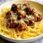 This Easy Garlic Butter Meatballs recipe features tender, flavorful meatballs served atop creamy Parmesan linguine. The dish combines savory meatballs cooked in butter and olive oil with a rich, garlicky cream sauce, making it a comforting family favorite that’s ready in just 40 minutes.