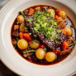 Once your roast has reached that perfect tenderness, carefully transfer the beef to a serving platter, arranging the veggies around it like a vibrant, comforting feast. Skim any excess fat from the sauce left in the pot and spoon it generously over the beef and vegetables to keep every bite moist and flavorful. Finally, sprinkle chopped green onions and toasted sesame seeds on top for that beautiful finishing touch and extra flavor pop.