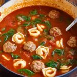 A comforting and hearty Meatball and Tortellini Soup featuring tender meatballs, cheesy tortellini, and fresh spinach simmered in a flavorful tomato and beef broth base. Perfect for a quick and satisfying meal ready in just 30 minutes.