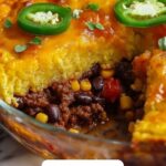 A hearty Mexican Cornbread Casserole combining seasoned ground beef, diced tomatoes with green chilies, and corn, topped with a creamy cornbread mixture and cheddar cheese. This comforting casserole bakes until golden and bubbly, perfect for family dinners or potlucks.
