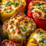 These Mexican Stuffed Peppers are a vibrant and hearty main course featuring bell peppers filled with a flavorful mixture of ground beef, rice, black beans, corn, and spices, all topped with melted Mexican blend cheese. Perfectly baked to meld the flavors, this dish offers a comforting and nutritious Tex-Mex meal with a delicious balance of protein, fiber, and spices.