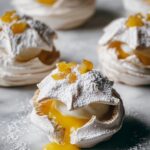 A delightful dessert featuring light and airy meringue shells filled with tangy mango curd and a rich miso caramel swirl, blending sweet, tart, and savory flavors for a unique and elegant treat.