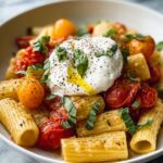 If you’re craving a pasta dish that feels indulgent yet fresh, look no further than this Rigatoni with Burrata and Burst Tomatoes Recipe. It combines the comforting chew of perfectly cooked rigatoni with vibrant, juicy burst tomatoes and the creamy, dreamy softness of burrata that melts in your mouth. The balance of textures and flavors—from sweet tomatoes to the slightly tangy balsamic and a hint of heat from red pepper flakes—makes every bite a celebration. This dish is so simple to prepare yet packed with fresh, wholesome ingredients that turn a weeknight dinner into something truly special.