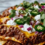 5. Add Cheese and Jalapeños: Sprinkle shredded cheddar and mozzarella cheeses evenly over the beef and chips. If using, scatter sliced pickled jalapeños on top for a spicy kick.