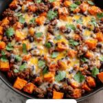 This Sweet Potato Chili Casserole is a hearty and flavorful dish combining ground beef or turkey with sweet potatoes, black beans, corn, and a blend of spices. Baked to perfection and topped with melted cheese, it makes for a comforting and wholesome meal perfect for family dinners.